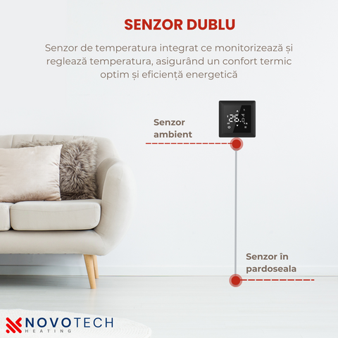 Include 2 senzori: un senzor de aer încorporat și un termistor de senzor de podea cu 10 picioare de cablu NTC (12K). Senzor de Podea Inclus. Senzorul de podea permite sistemului de incalzire Novotech să funcționeze cu eficiență maximă, monitorizând temperatura podelei.